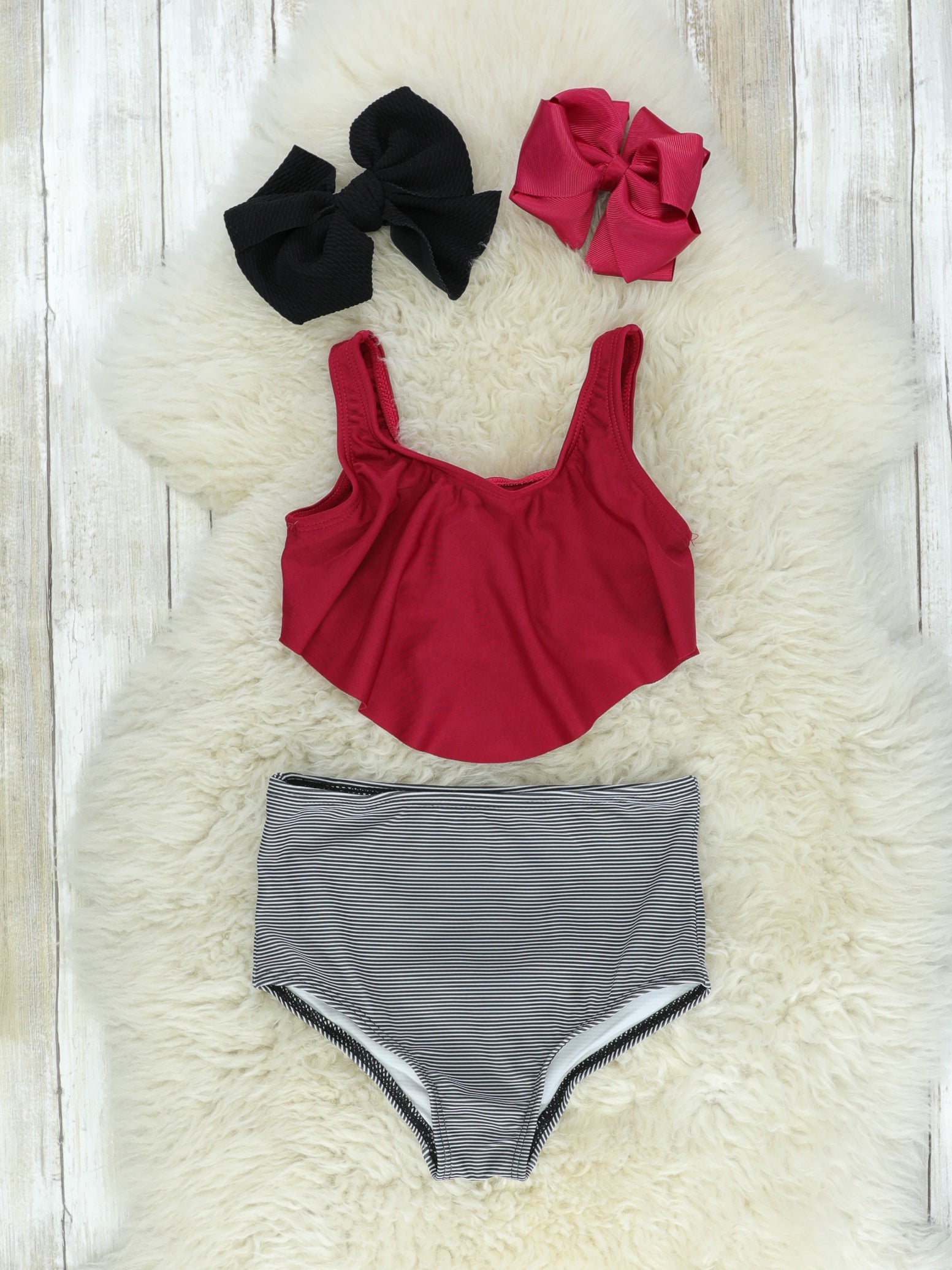 It's almost swim season and this swimsuit is perfect for days at the pool! We love this wine & gray pinstripe set- the high waist makes it super easy for diaper changes, too!
