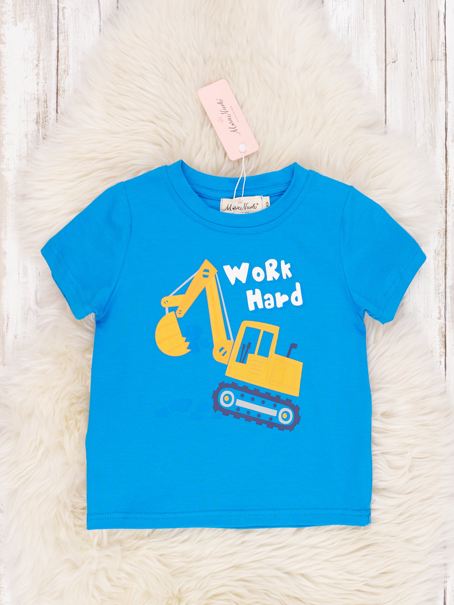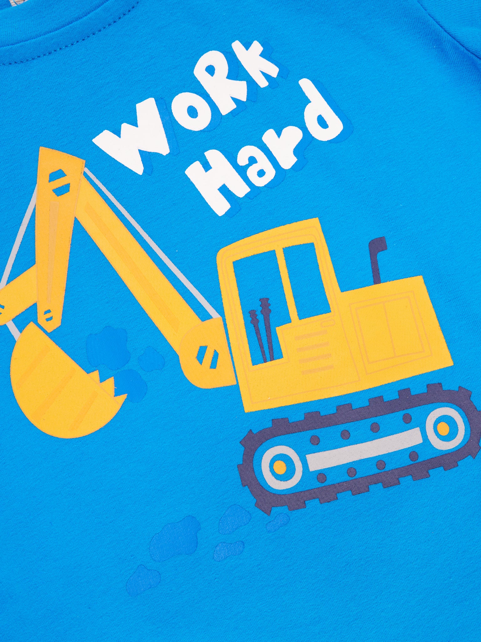 Put your mini-me to work with this cool blue top featuring an excavator graphic that reads "Work Hard"! Perfect for any aspiring builder, this shirt will surely have your little one building something great with style.