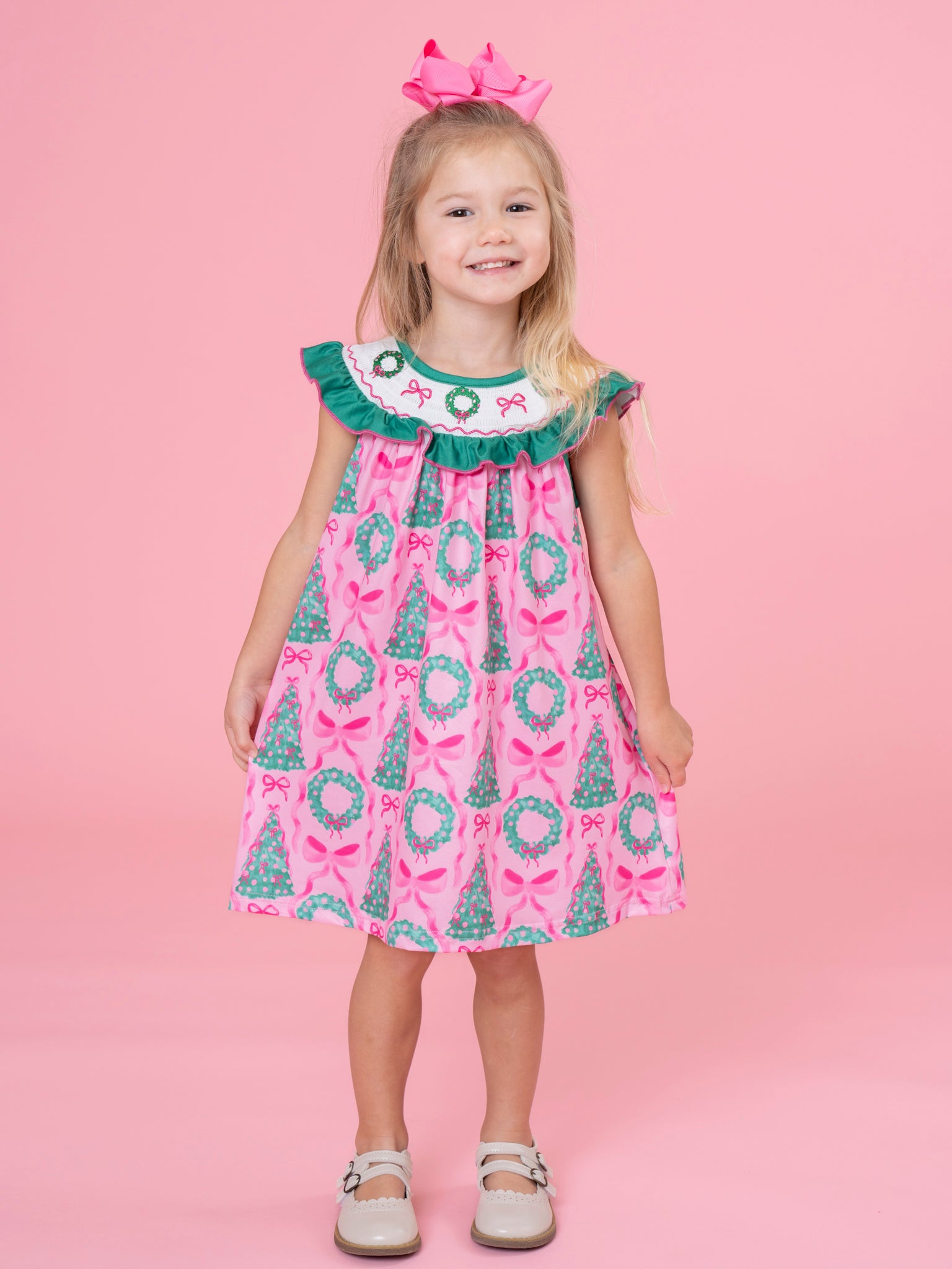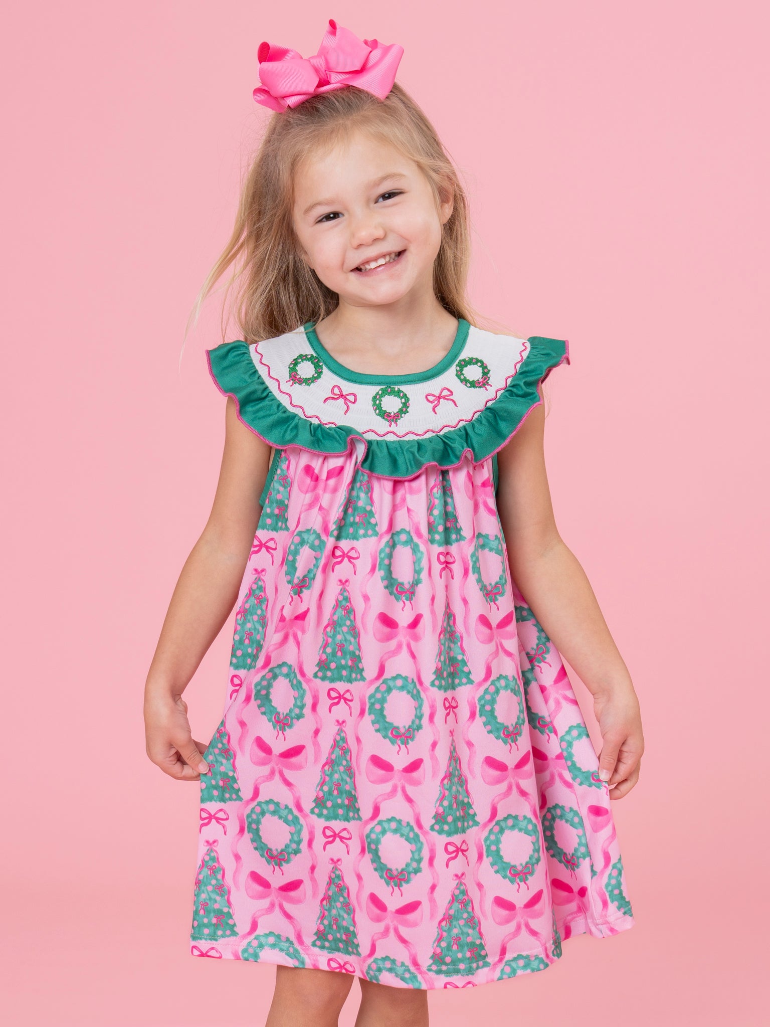The Wreath & Trees Holiday Smocked Dress by Marie Nicole Clothing is a festive sleeveless dress adorned with cheerful wreath and Christmas tree prints, accented by a sweet green ruffle collar. This dress combines playful holiday designs with a comfortable, flowing fit, making it perfect for any seasonal celebration or special occasion during the holidays.