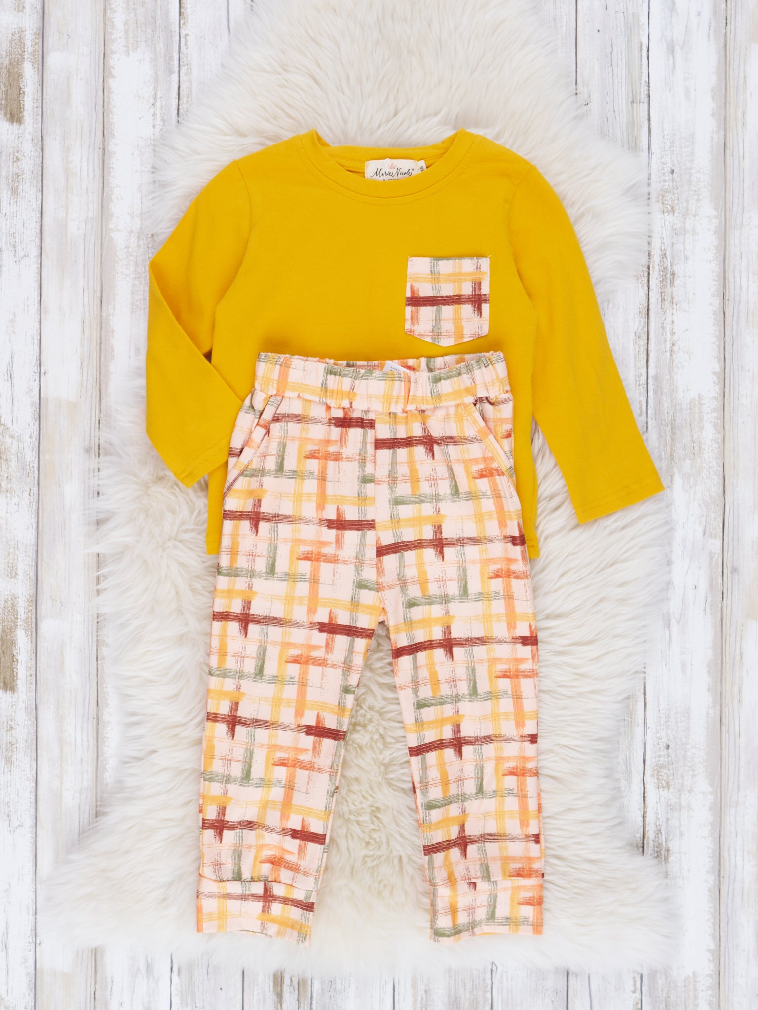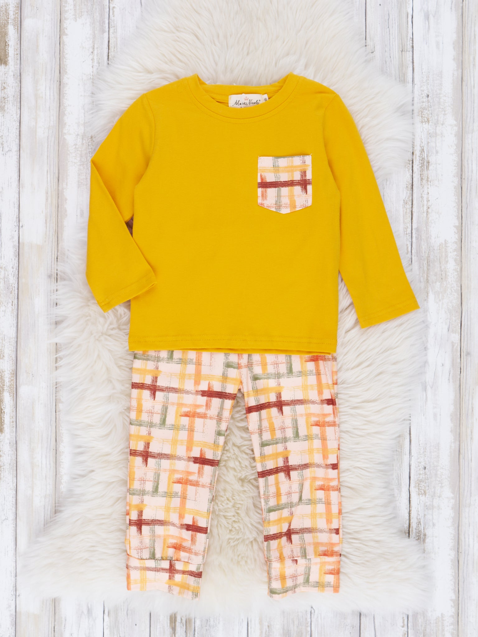 This sweet autumn sibling set is perfect for a fall festival! Your littles will be ready for a hay ride in this outfit featuring a long-sleeved top with a plaid pocket and matching elastic band plaid pants.