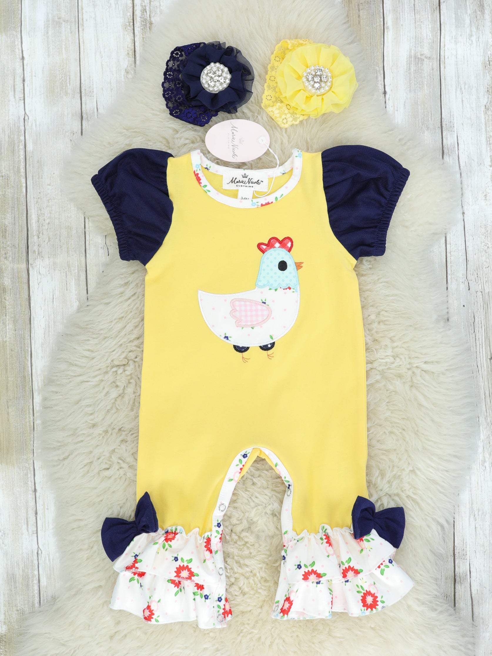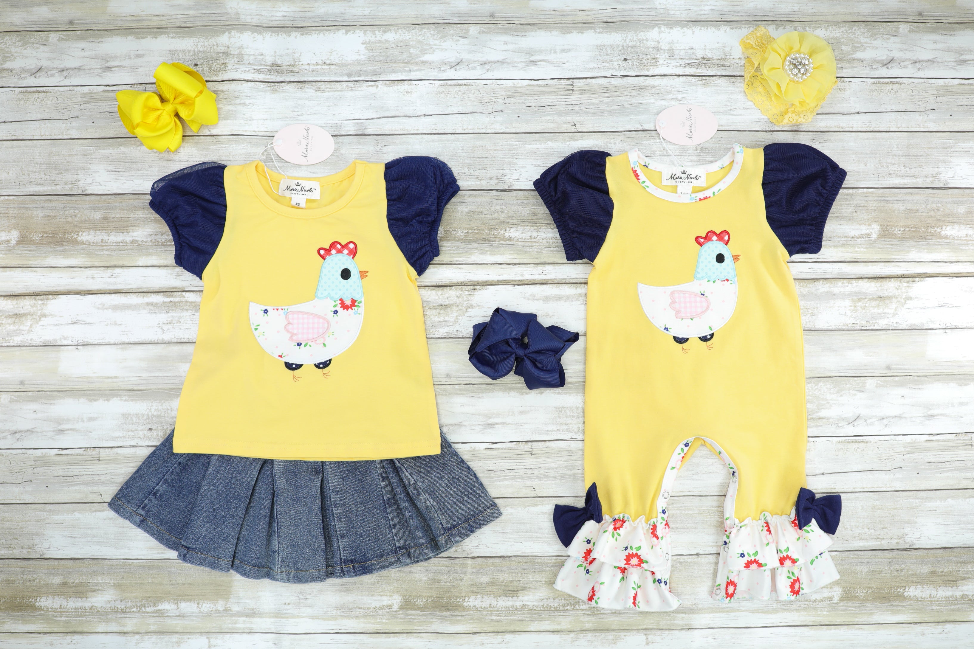 Just chicken in to talk about how cute this sister set is! This romper features the most adorable floral ruffles and chicken appliqué!
