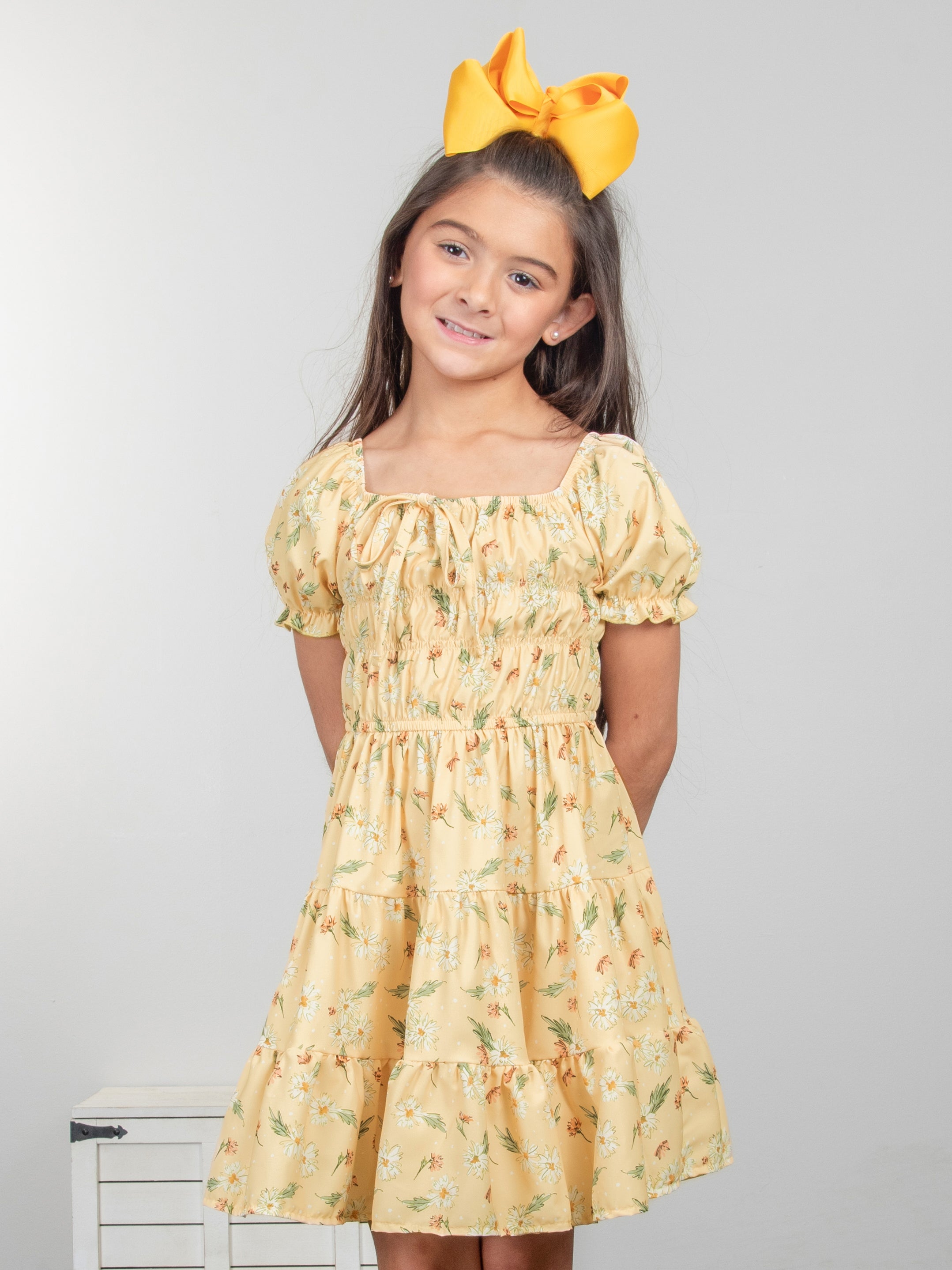Dress all your girls in this darling sister set! This tiered yellow dress features darling daisies, a tie detail, & cinched sleeves.