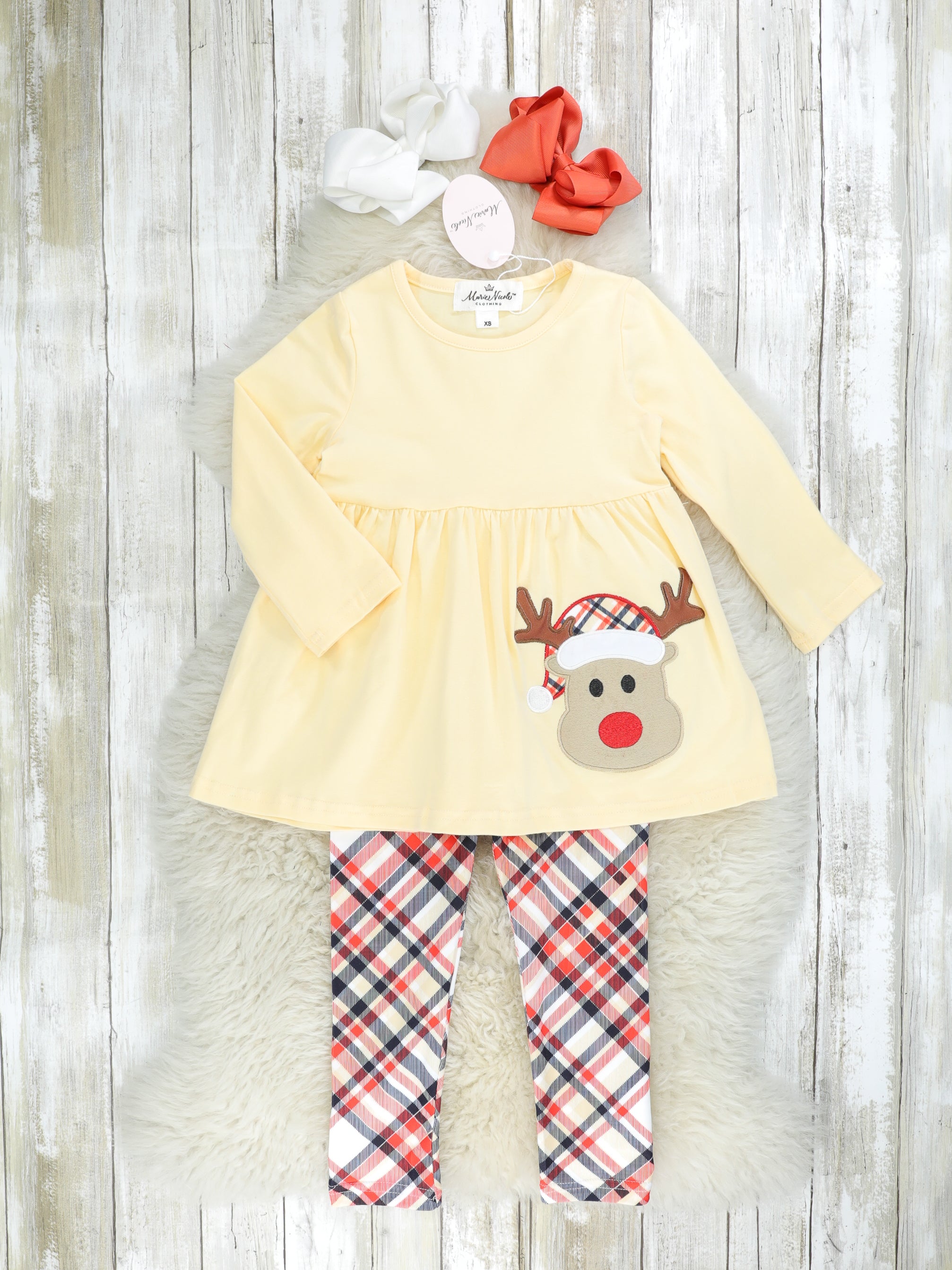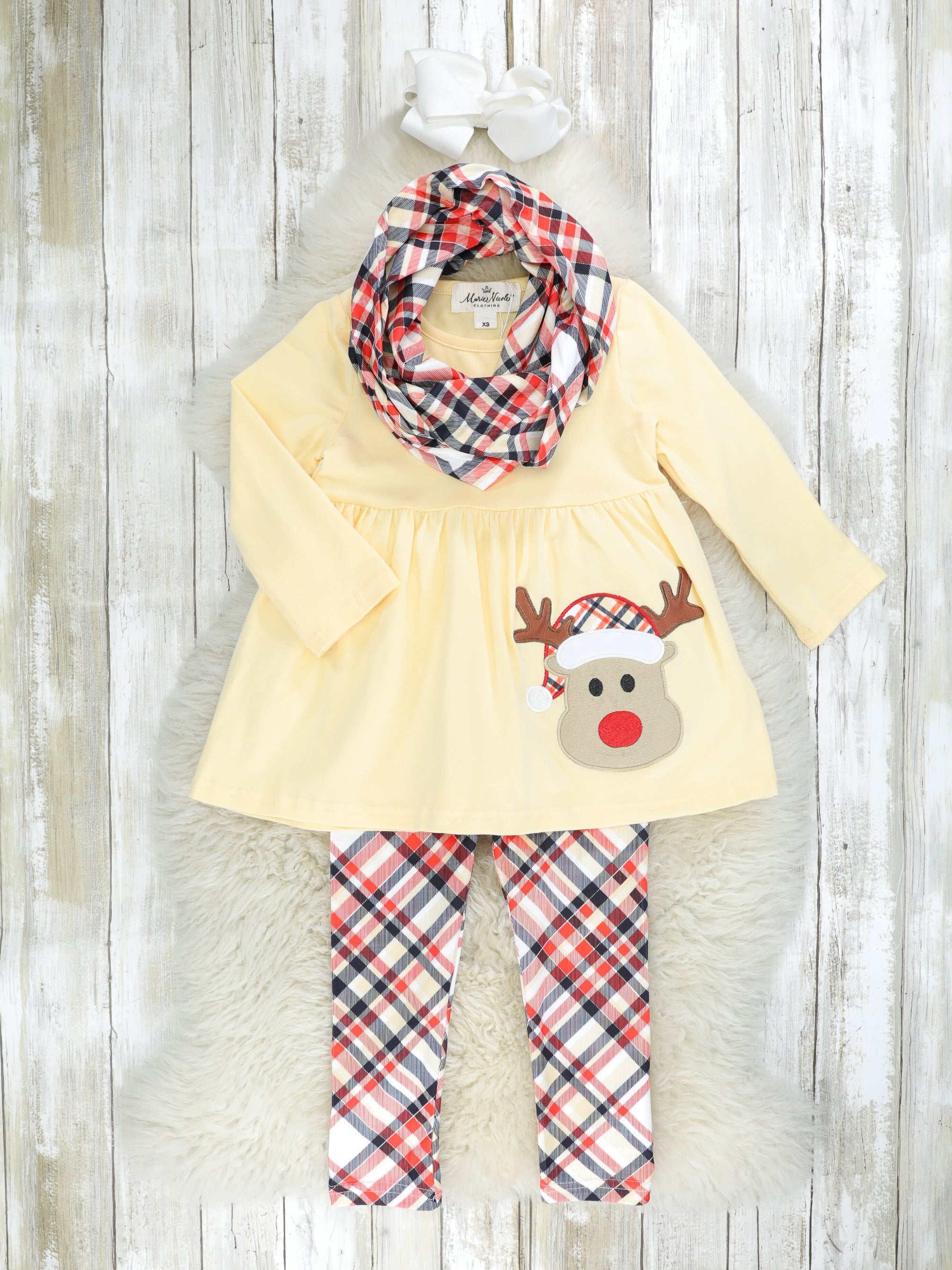 This charming set is so deerly adorable! This outfit features a yellow peplum top with a red nose reindeer appliqué, red plaid pants with an elastic waistband, & a matching plaid scarf.