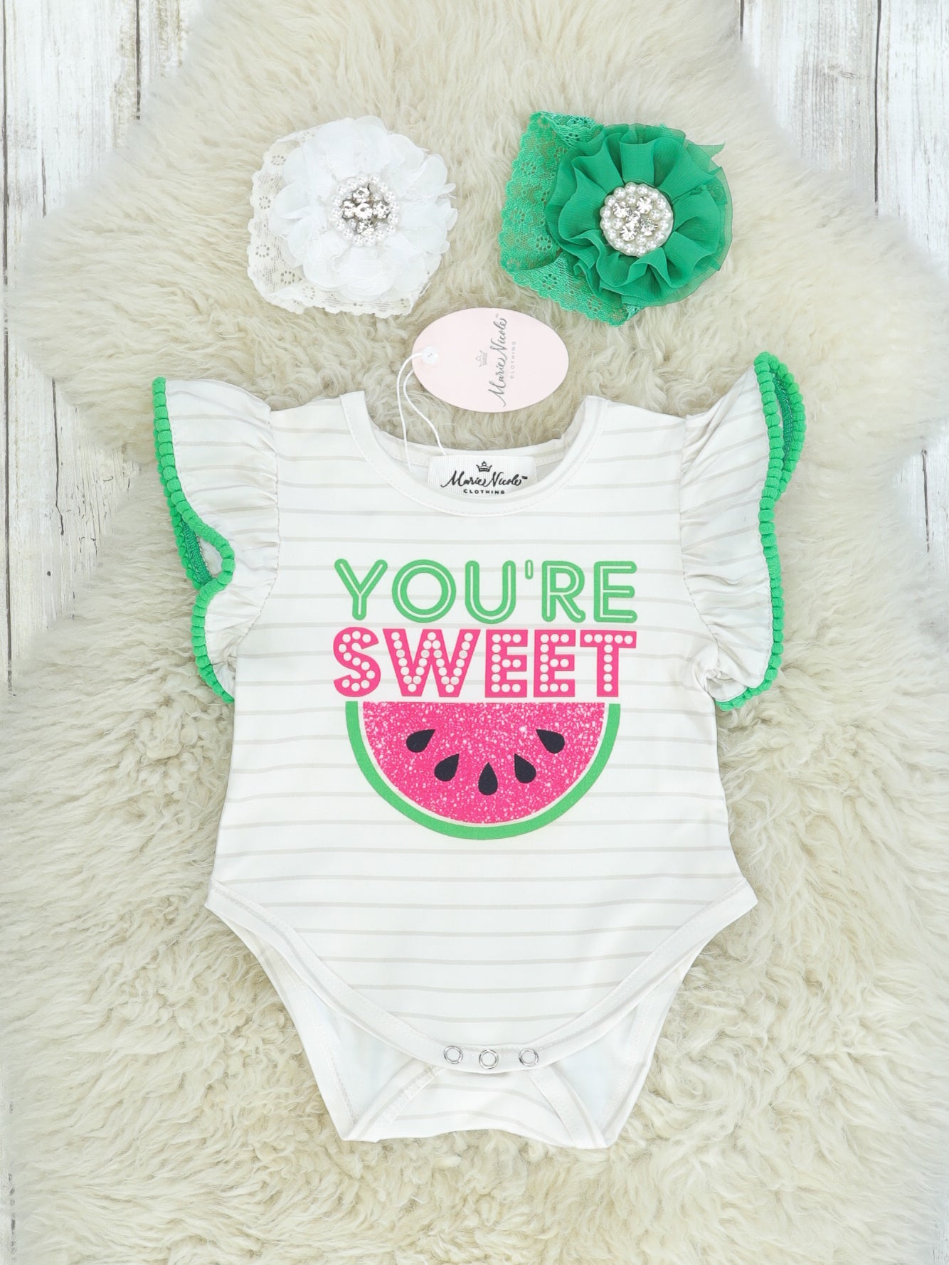 This is a one in a MELON sister set for Summer! This striped romper features flutter sleeves with green trim, a "You're Sweet" sparkly watermelon detail, and snap buttons making for easy diaper changes.